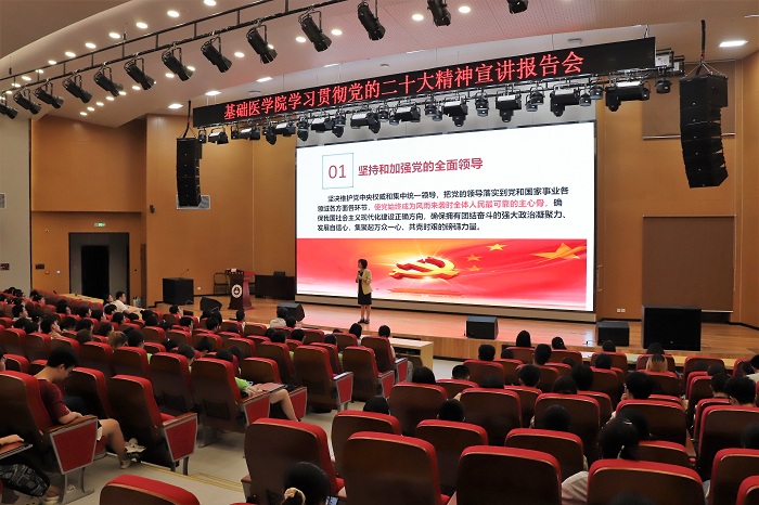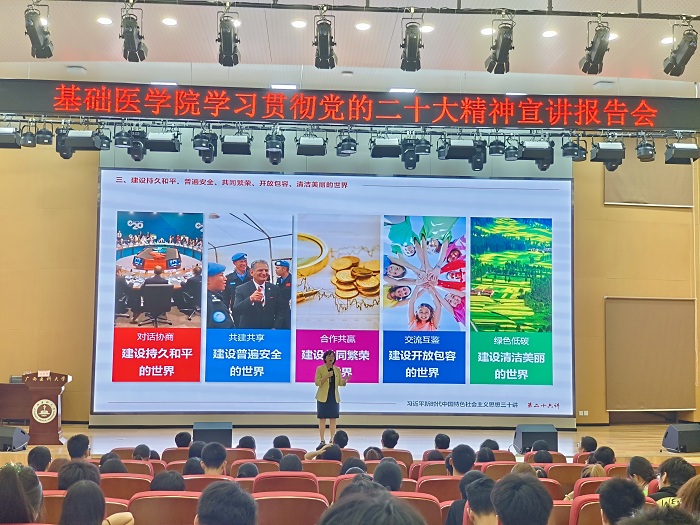 报告会上,温丽华老师紧紧围绕党的二十大精神的内涵要义、实践要求,从为什么要听党话跟党走、新时代党的使命是什么、当代青年如何承担使命这三个方面,同与会师生一起回顾了中国近现代史、中国共产党党史和中国共青团团史,并深入浅出地论述了这三者的内在关联。温老师全面重点论述中国式现代化的五个基本特征,对当代青年提出了“八争八不争”的殷切期望,也对辅导员老师发出“要做青年友,不做青年‘官’”的倡议。温老师的报告以鲜活生动的事例和幽默风趣的语言、深厚透彻的理论对党的二十大精神进行了阐释,进一步加深了师生的理解和感悟。报告会后,与会师生纷纷表示要坚定不移地感党恩、跟党走,在强国建设、民族复兴的生动实践中贡献医大青年力量。