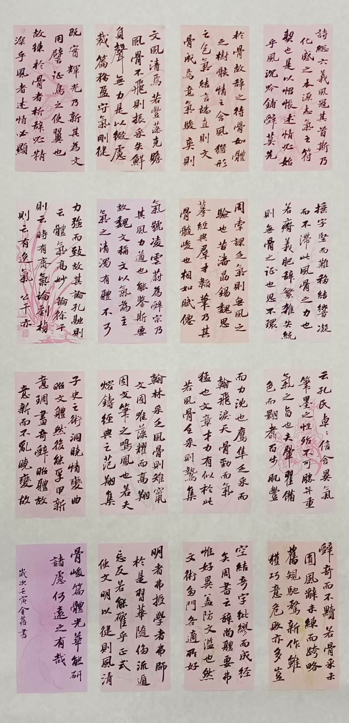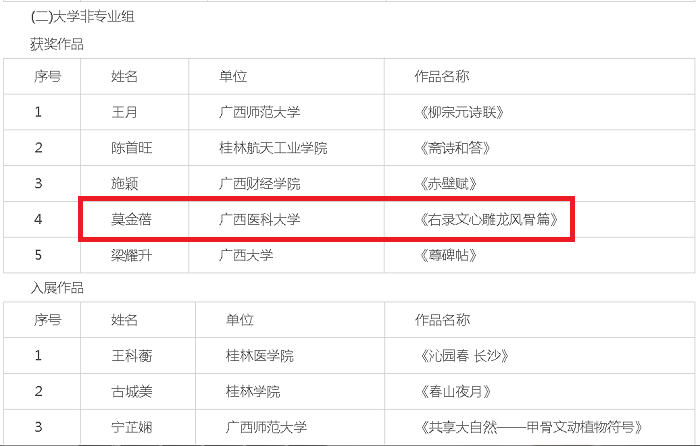 近日,由广西壮族自治区教育厅举办的“园丁杯”广西教育系统第七届书法篆刻作品展评选结果公布,伟德betvlctor19462020级临床医学8班莫金蓓同学的作品《右录文心雕龙风骨篇》在大学非专业组的评选中获奖,是我校唯一入选并获奖的作品。据悉,此次评选共评出获奖作品30件,入展作品233件,入选作品508件,其中在大学非专业组中,共评出获奖作品5件,入展作品28件,入选作品43件。