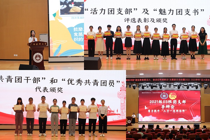 团支书答辩结束后,学院团委书记梁福秋老师对“活力团支部”进行了点评。她表示各团支部的表现相较于上一年有较大进步,并予以肯定,同时指出团员们要学习贯彻习近平新时代中国特色社会主义思想,做到学思想、强党性、重实践、建新功,激发了团员们青春向上,奋进征程的决心。学院团委副书记谭璟婧老师宣读了2022年度“优秀共青团干部”和“优秀共青团员”的表彰决定,并对五四评优获奖代表和“活力团支部”获奖代表进行颁奖。最后,全体人员重温入团誓词,说出青春誓言,至此活动圆满结束。