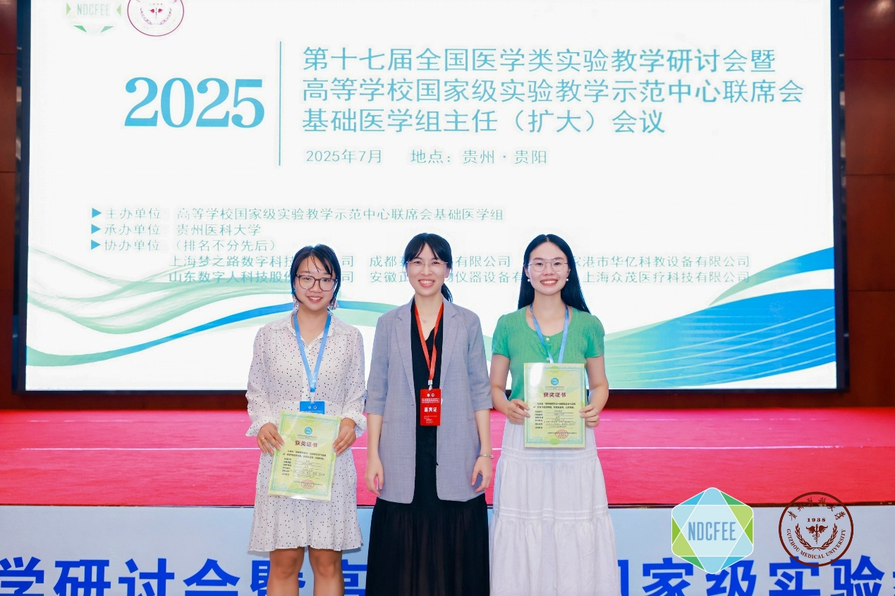 会议期间,罗彬受邀作《强基铸魂,数字赋能-新医科背景下基础医学金课建设的守正与创新》专题报告,系统阐述了学院基于OBE理念在“金课”建设方面的创新举措与显著成效,并重点分享了AI赋能课程改革中的实践经验,引发了与会专家的高度关注和一致好评。在同期举办的第十七届高等学校医药类课程一流课堂设计展示大赛中,我院教师表现优异,细胞生物学与遗传学教研室李小翠老师荣获二等奖,病理生理学教研室邓冯媛老师荣获三等奖。