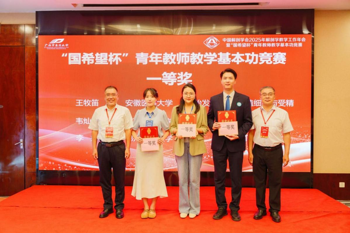 作为年会的重要组成部分,青年教师教学基本功竞赛同期举行,来自全国各级各类院校的23名优秀青年教师同台竞技,经过教案评审、现场授课演示等环节的激烈角逐,我院人体解剖学教研室教师韦灿燊凭借扎实的专业功底、创新的教学设计和出色的临场表现,在竞赛中脱颖而出,斩获大赛一等奖(全国三名)。